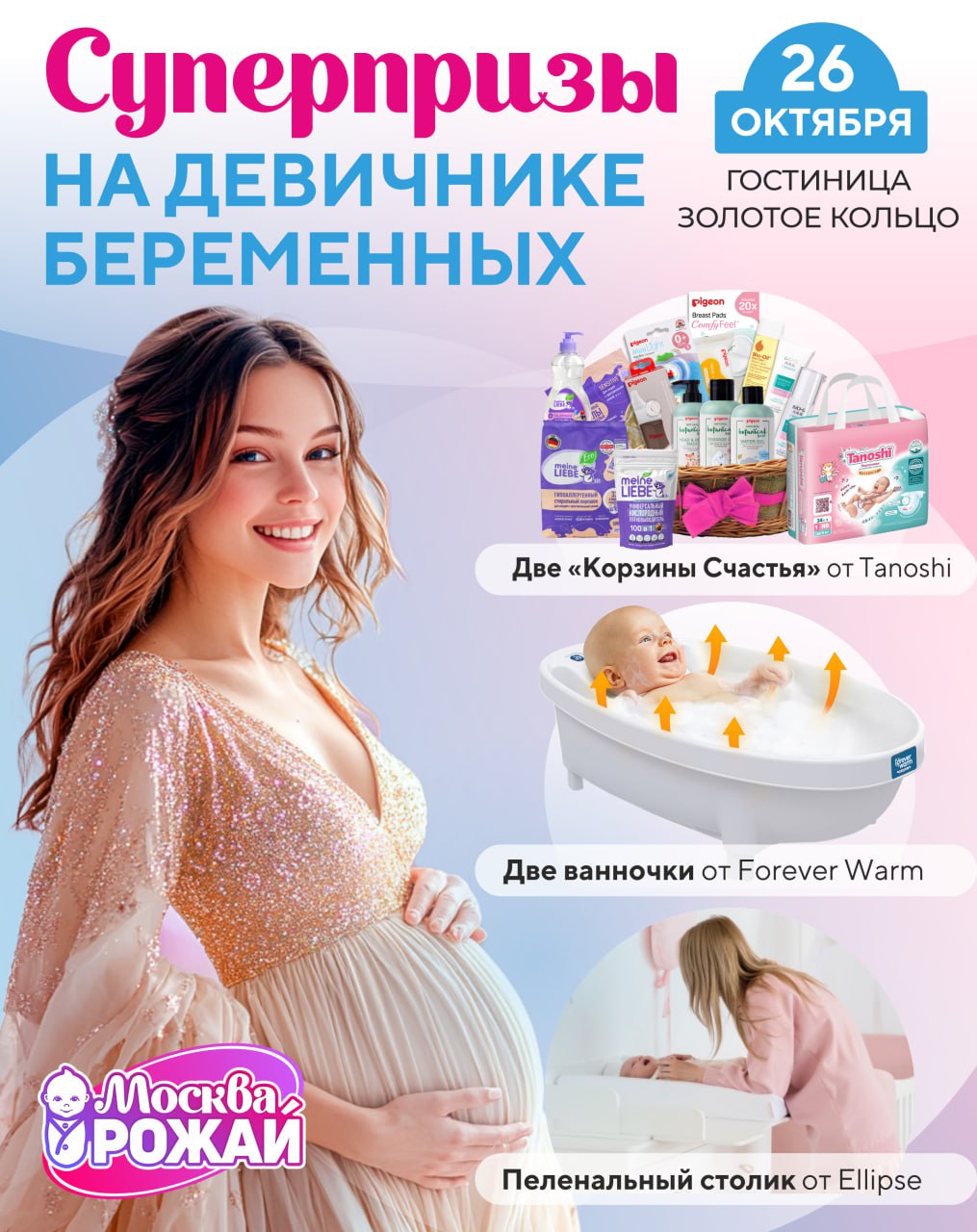 | Ждем вас уже в эту субботу! | | Вы станете участницей самой масштабной и яркой встречи будущих мам столицы! Празднуем День Рождения Президента Клуба беременных вместе ✨ Адрес: Отель "Золотое Кольцо", ул. Смоленская, д.5. Зал "Golden Ring Hall", главный вход | | | | Программа мероприятия | | Предлагаем Вам ознакомиться с программой лекций на каждой из сессий мероприятия. | | | | Розыгрыш СУПЕРПРИЗОВ и море подарков! | Приглашаем вас на девичник беременных, где мы разыграем СУПЕРПРИЗ — Пеленальный столик от Ellipse. ⚡ Что нужно сделать для участия в розыгрыше? - Прийти на мероприятие 26 октября